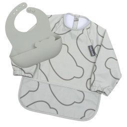 - Deux protections complémentaires : un bavoir en silicone avec poche récupératrice + un bavoir tablier manches longues pour couvrir les bras et le torse.