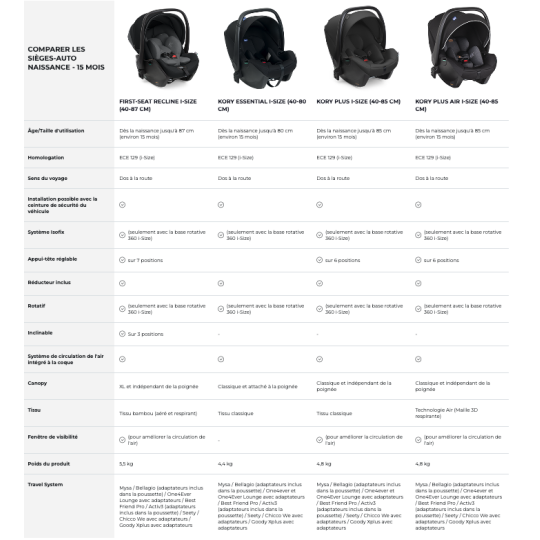 Découvrez le siège-auto Coque CHICCO KORY Plus AIR i-Size, utilisable dès la naissance jusqu’à 15 mois. Respirant, facile à installer et compatible avec plusieurs poussettes. Certifié 4 étoiles ADAC et TCS (octobre 2023).