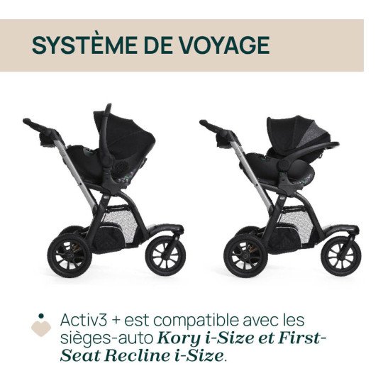 Composé de la poussette Activ3, de la nacelle Activ3 et de la coque auto Kory Essential i-Size, ce système de voyage complet accompagne votre enfant de la naissance jusqu’à ses premières grandes balades.