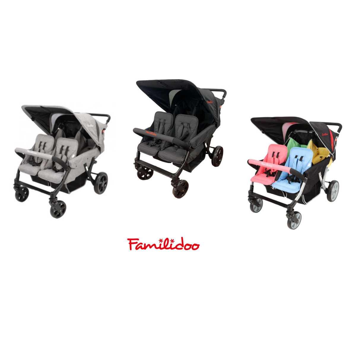 Retrouvez deux modèles de poussettes 4 places chez Familidoo: