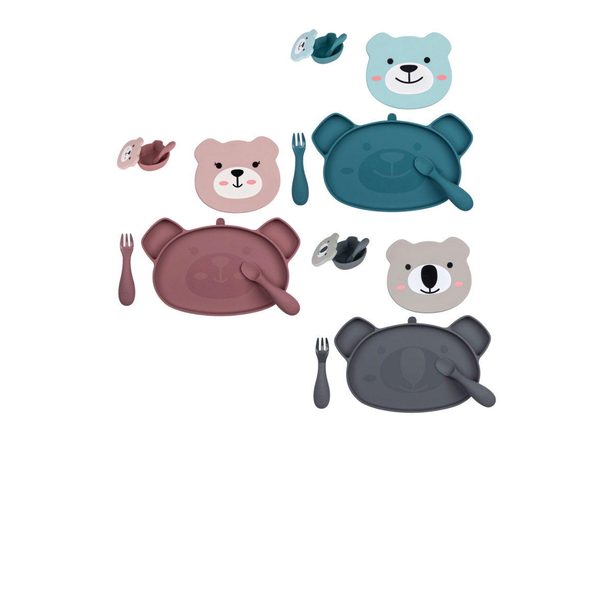 Assiette, bol/couvercle et cuillère en 100% Silicone alimentaire.